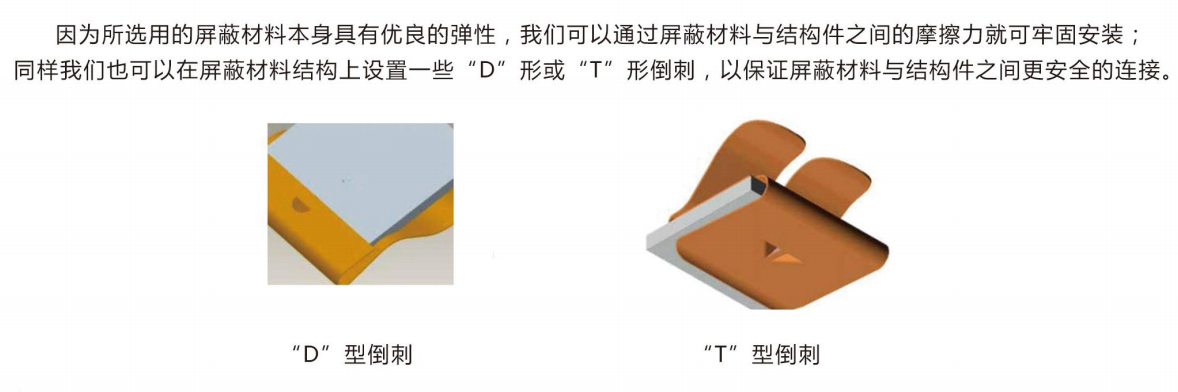 2. 卡裝式安裝:通過(guò)屏蔽材料和結(jié)構(gòu)件之間的摩擦力就可牢固安裝,自帶“D”形和“T”形倒刺便于更安全連接