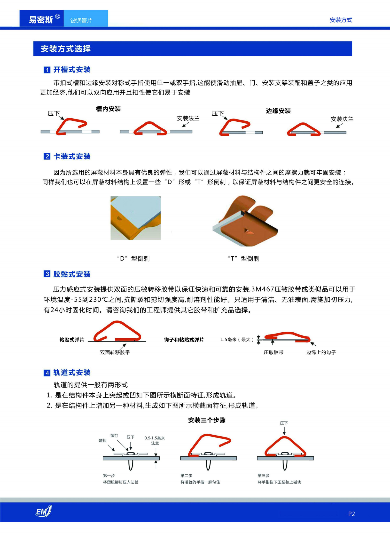 易密斯鈹銅簧片(BeCu Fingerstock)具有較好的抗壓性、回彈性和耐腐蝕性,并提供很好的寬頻電磁屏蔽效果。為了安裝方便,金屬簧片的安裝形式既有開(kāi)槽、卡裝、膠粘、又有軌道、壓接和鉚接等等,具體的安裝示意圖請(qǐng)參考以下信息
