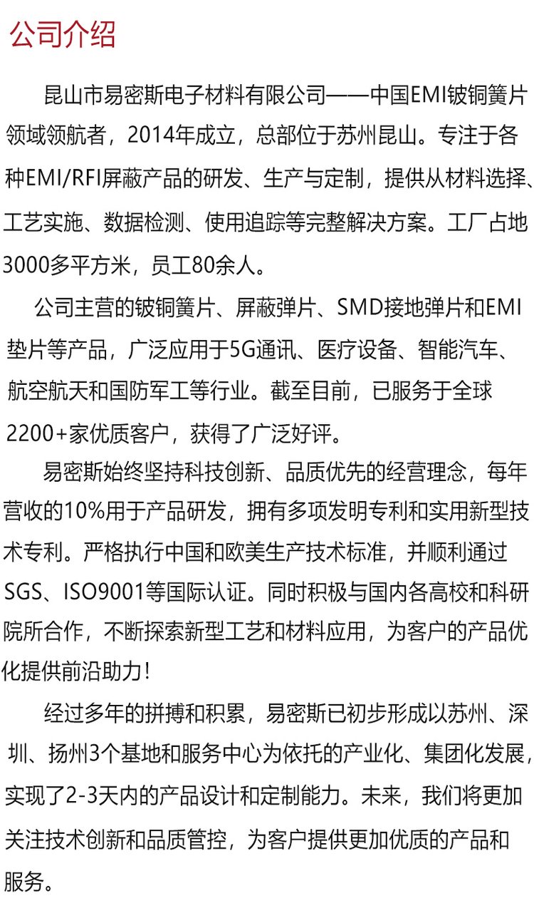所以,要想選擇好的金屬簧片廠家,還請(qǐng)認(rèn)準(zhǔn)[易密斯]鈹銅簧片,10年以上生產(chǎn)經(jīng)驗(yàn),60%市場(chǎng)占有率,1對(duì)1定制生產(chǎn)方案與及時(shí)的售后服務(wù),讓用戶金屬簧片買的放心,用得稱心。易密斯屏蔽簧片專心專注,只為提升客戶生產(chǎn)工藝。