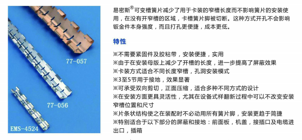 EMS-78-056鈹銅簧片多少錢,一款好的鈹銅簧片,不僅要具有價格優(yōu)勢,同時要能滿足廠家生產(chǎn)工藝的實際需求,所以購買的朋友在考慮簧片多少錢的同時,更要注重所采購的屏蔽簧片質(zhì)量的穩(wěn)定性。易密斯屏蔽材料作為國內(nèi)屏蔽行業(yè)的翹楚,有著10年以上工廠經(jīng)驗和全套生產(chǎn)設(shè)備,產(chǎn)品通過ISO9001質(zhì)量體系認證。已成功為國內(nèi)眾多廠家提供了優(yōu)良產(chǎn)品和貼心服務(wù)。